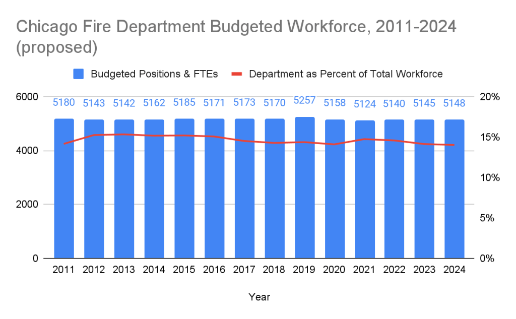 The proposed 2024 budget increases CFD’s budget by 1.7%, less than the department’s historical average but slightly greater than the city’s overall 1.3% budget growth from 2023 to 2024.